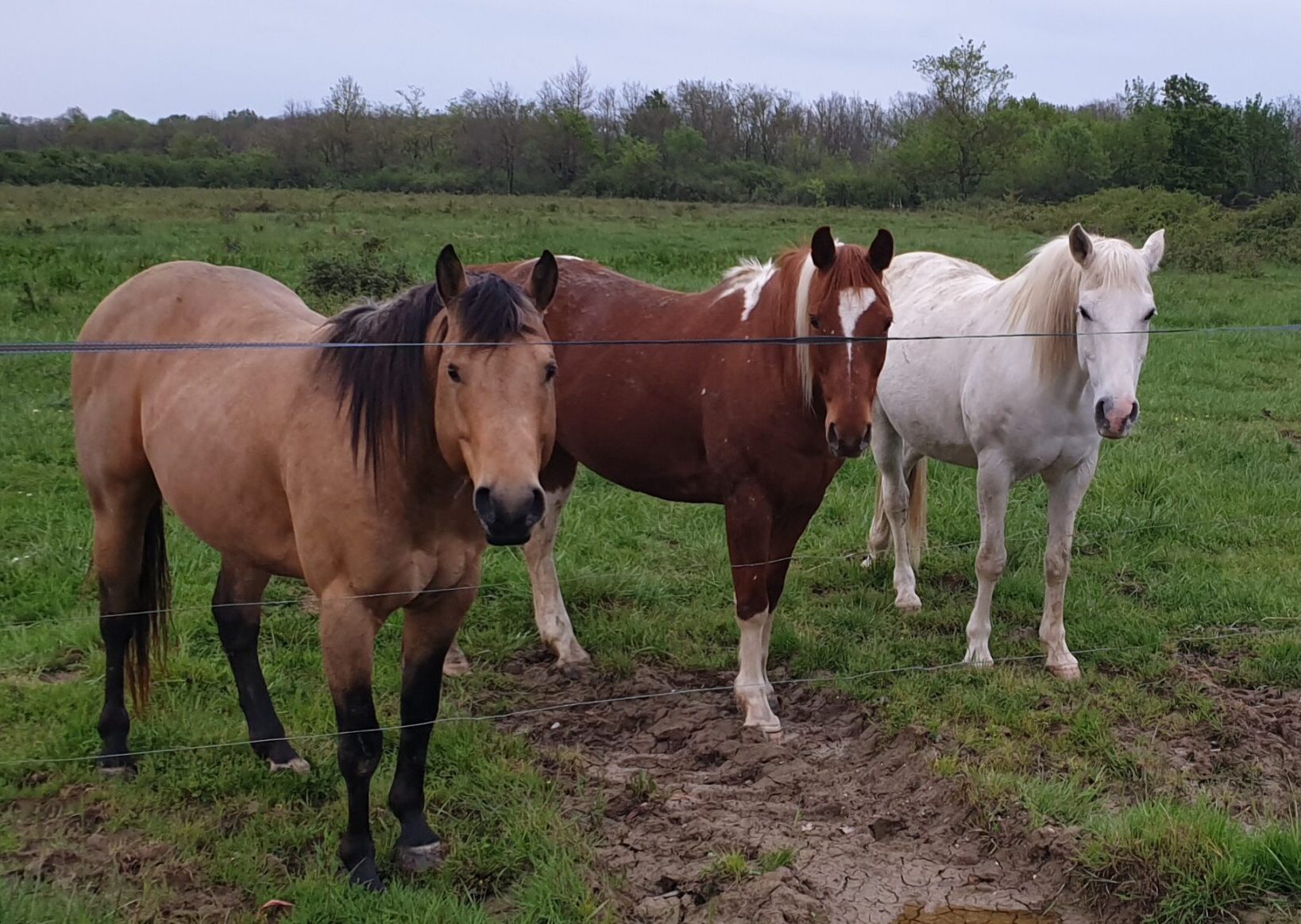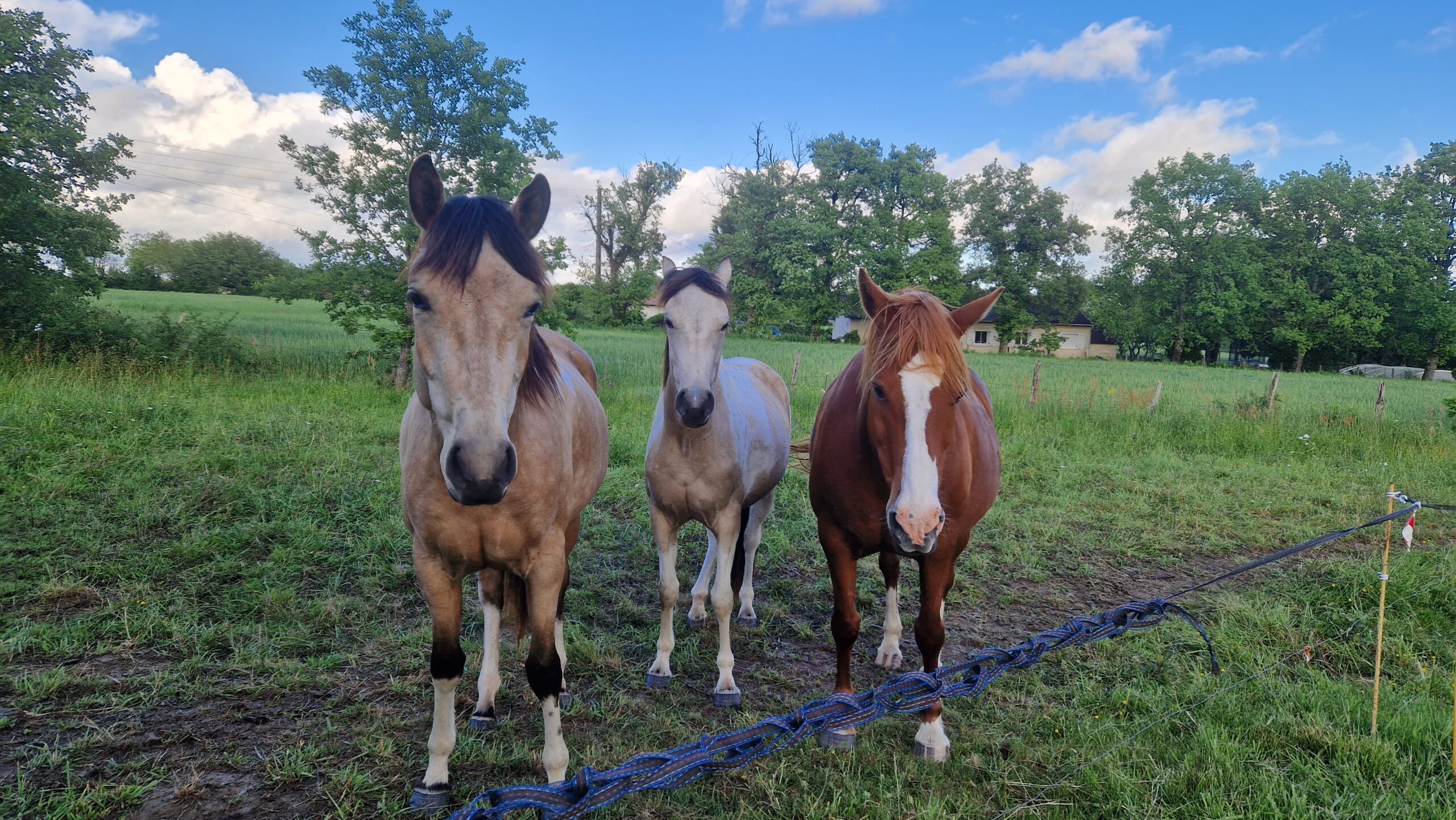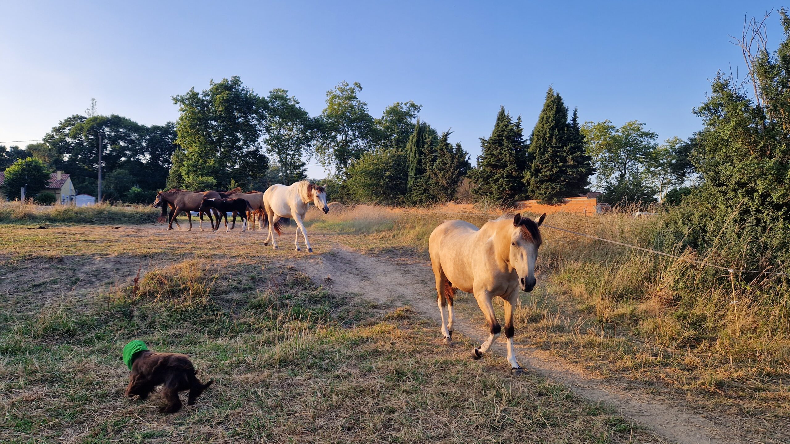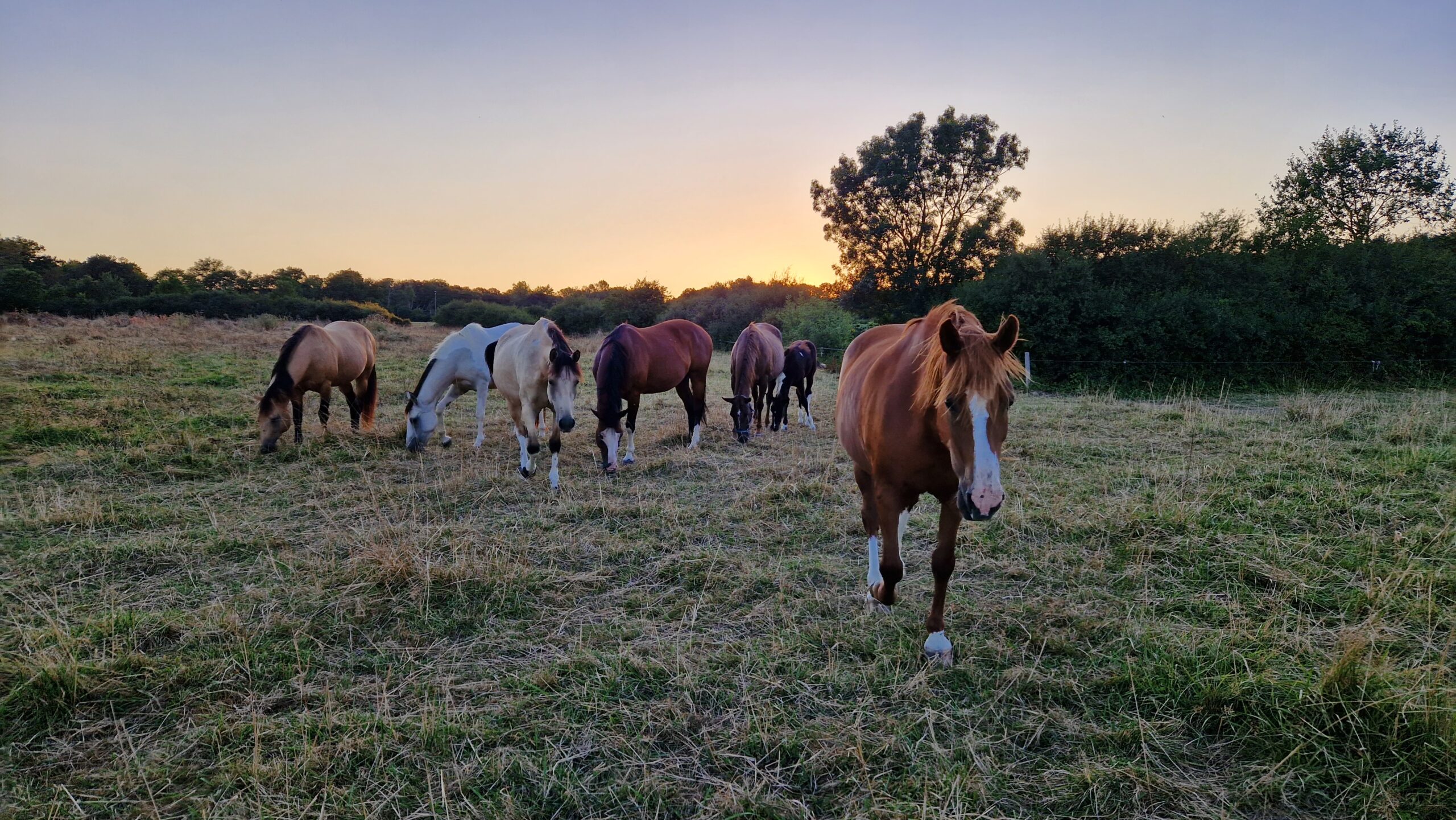 Sur les 10 ha de la ferme les chevaux vivent en troupeau. Nous adaptons la monture au cavalier (niveau, poids et taille).