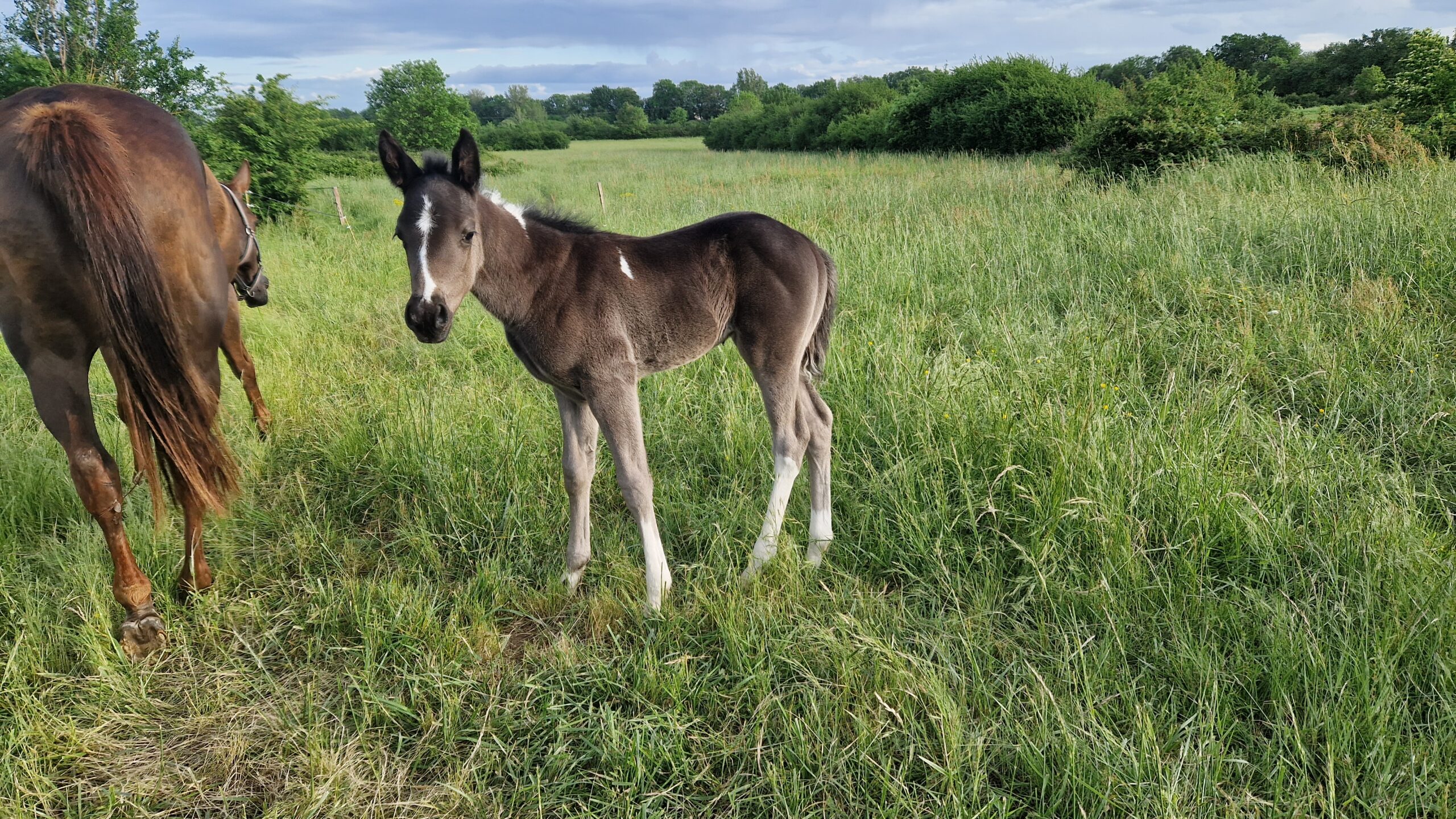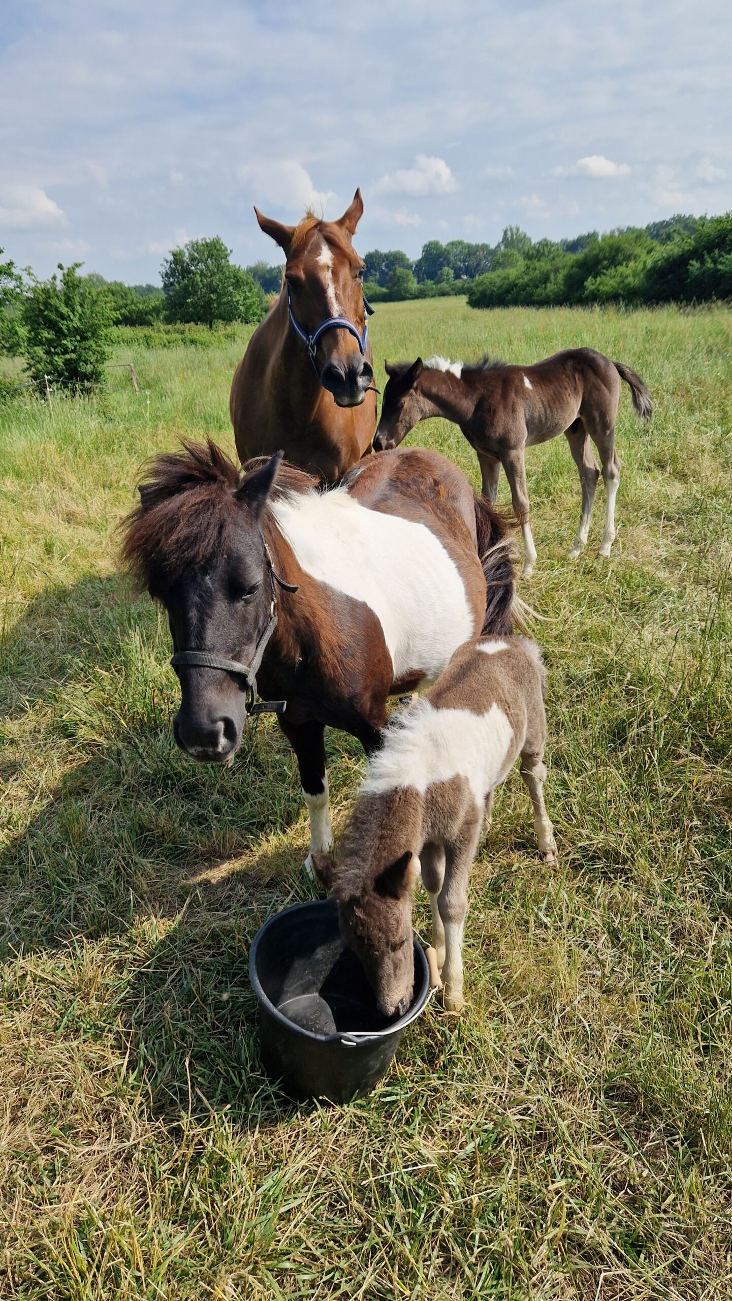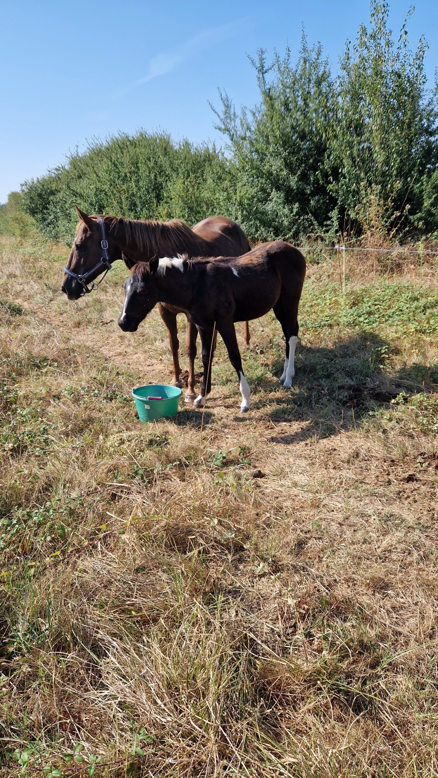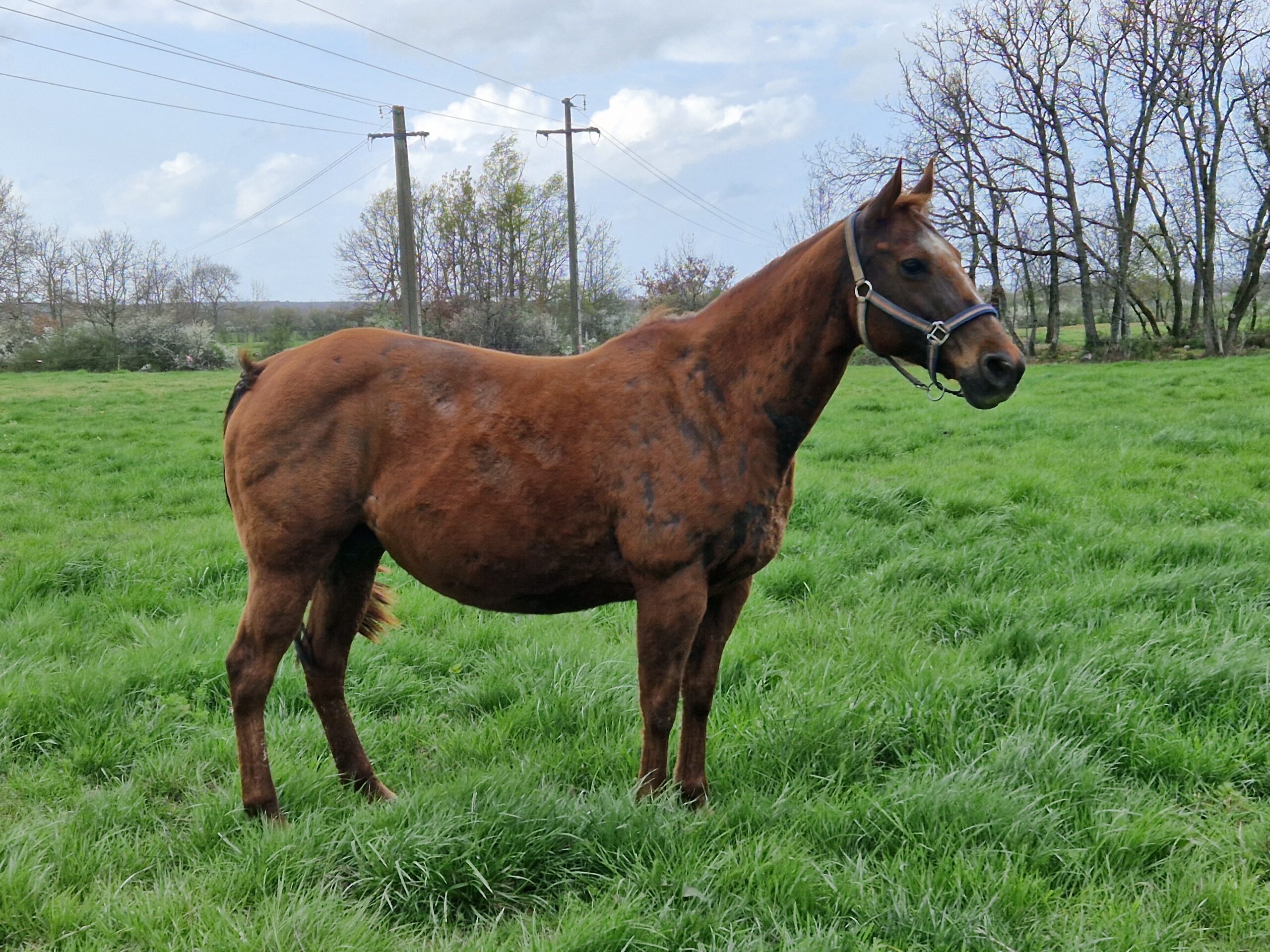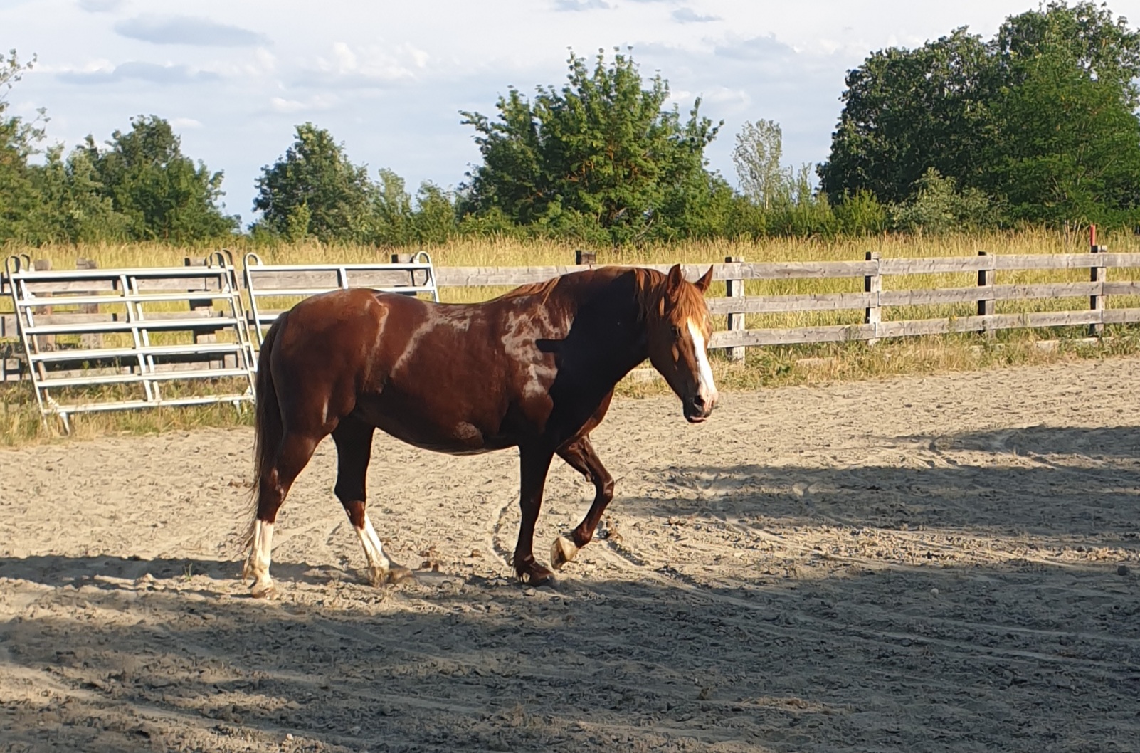 Sur les 10 ha de la ferme les chevaux vivent en troupeau. Nous adaptons la monture au cavalier (niveau, poids et taille).